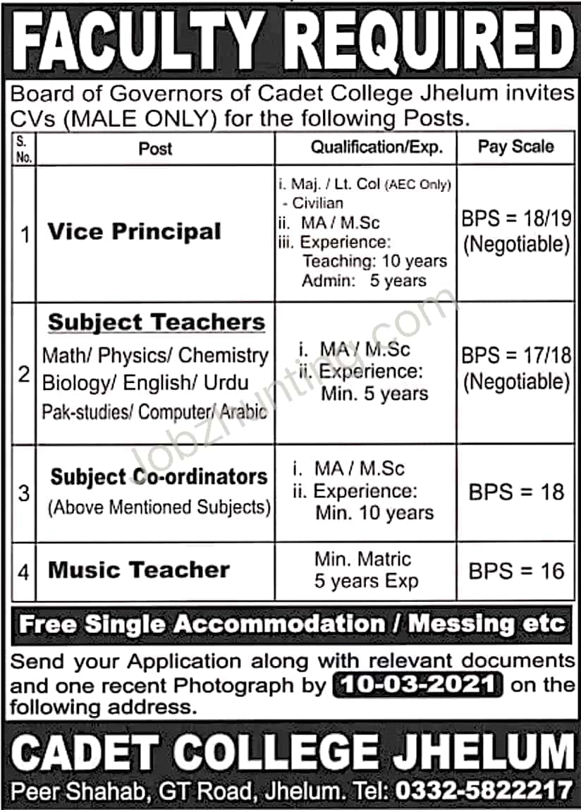 Here, I am sharing New posts announced by Cadet College Jhelum. The college has announced the vacancies through two different advertisements. The one advertisement comprises of Teaching Staff and the other one is of Non- Teaching Staff jobs 2021. If you want to be apprise about latest opportunities so must visit my website Jobzhunting.com regularly. Read the post till end so you can Apply for these posts without any difficulty.