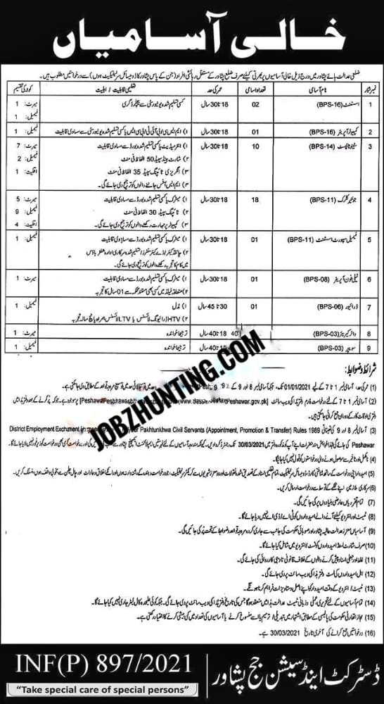 District and session Court pishawar has provided carrer opportunity for both male and females candidates for post of Assistant (bps 16) stenotypist (bps 14),junior clerk (bps 11) , Telephone operator (Bps 8) , Driver (bps 6, and s weaper (bps 3) .If you want to work in seesion court office and seeking for job then you are at right place.session court department has published job advertisement in daily mashriq newspaper and invited people to apply for the post of Assistant,stenotypist,junior clerk,telephone operator, driver,water carrier and s
