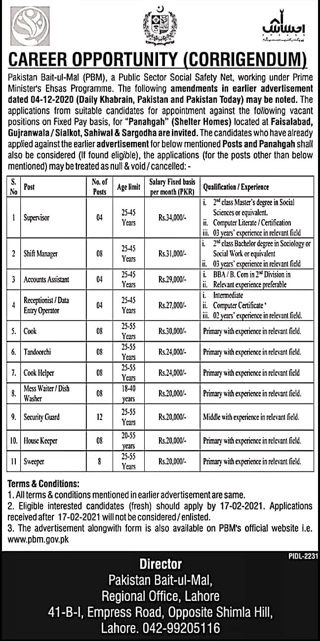Pakistan Bait-ul-Mal (PBM), an autonomous body set up through 1991 Act. PBM is significantly contributing toward penuriousness alleviation through its sundry poorest of the poor focused accommodations and providing assistance to destitute, widow, orphan, invalid, infirm & other needy persons, as per eligibly criteria approved by Bait-ul-Mal Board .The organization has announced multiple vacancies. PBM needs Experienced persons for ”Panahgah” (Shelter Homes) located at Faisalabad, Gujranwala/Sialkot, Sahiwal and Sargodha on Fixed Pay basis for different vacant positions. The Institution offers handsome salary according to Educational Qualification and Experience. If you want to become the part of this corporation then Apply must and before the Last Date. For this you have to visit the official website of PBM i.e www.pbm.gov.pk. Apply for the post according to yours Education. For more details about the position see the official advertisement which is given below.
